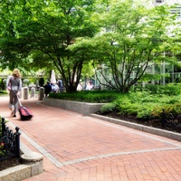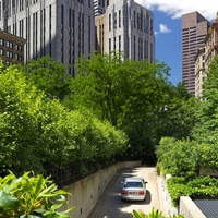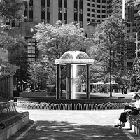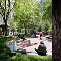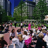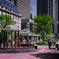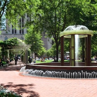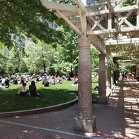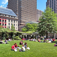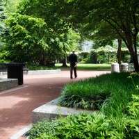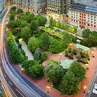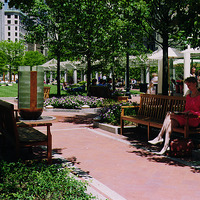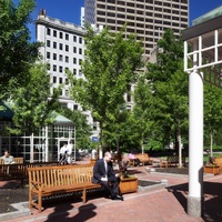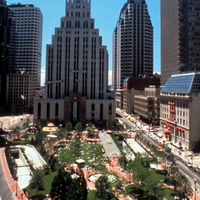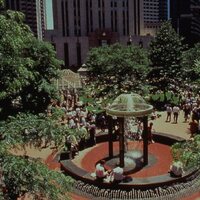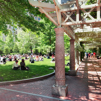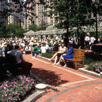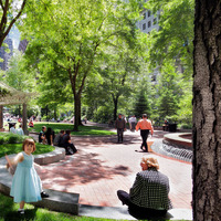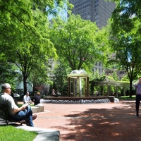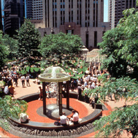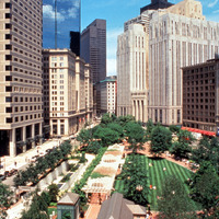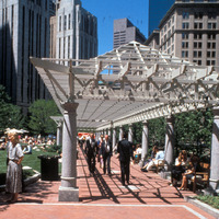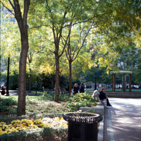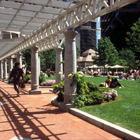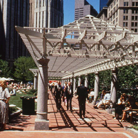 The park was created through an innovative public-private partnership at no cost to the public. The design emphasized providing a variety of opportunities for rest and recreation, creating visual and spatial relief from the park’s urban surroundings, incorporating abundant and varied flora, and providing a focal point for the financial district. The meticulously maintained park features a walk-through sculptural fountain and a 140-foot-long trellis over a pedestrian walkway. Safety is enhanced by keeping all points of the park open and within sightlines of the street, and a glass pavilion houses a year-round café. The park’s location in the midst of a heavily-trafficked district serves as a model for other cities attempting to integrate green space in crowded downtown areas. - Coverage